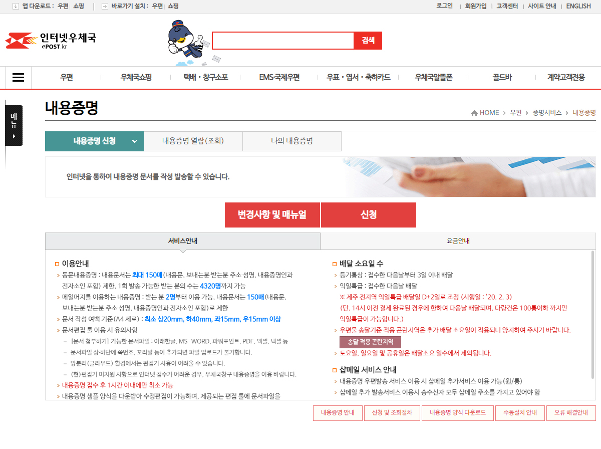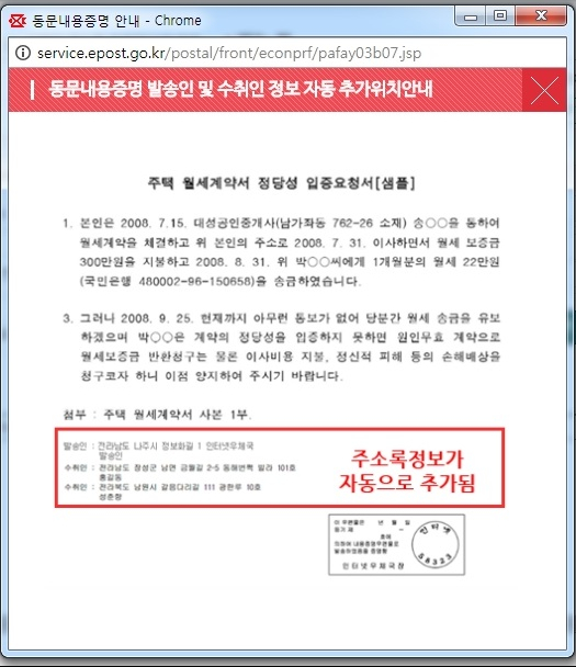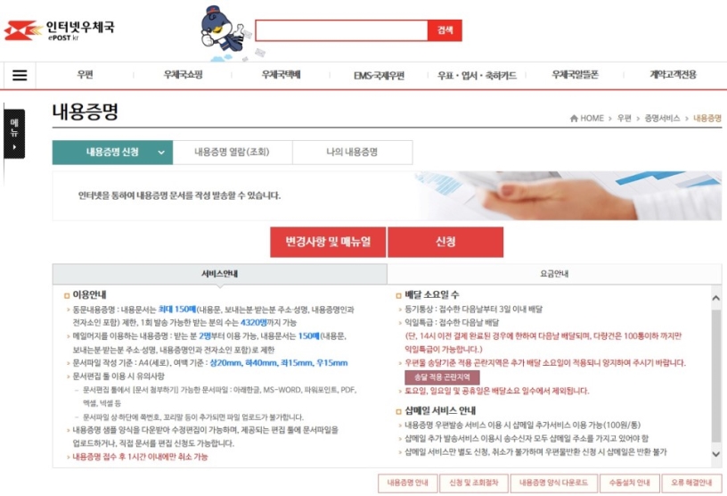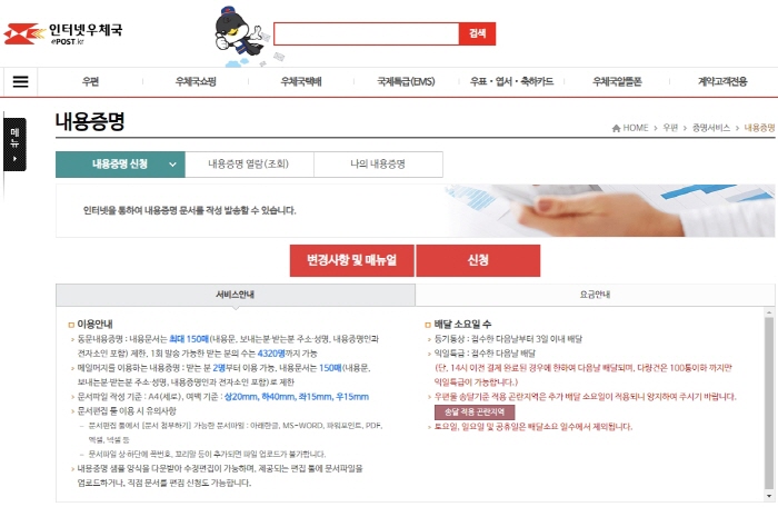 우편관서에서는 문서내용과 발송사실만을 증명해 줄 뿐이고 내용증명을 발송하였다는 사실만으로 법적 효력이 결성되는 것이 아님을 조심하여야합니다. 내용증명 우편물은 등기통상으로 취급되어 배달기록을 끼치고 있고 언제 배달하였다는 것을 증명하는 ‘배달증명’ 우편물로 발송하게되면 안전해요.