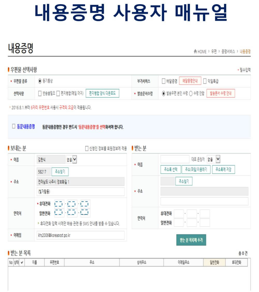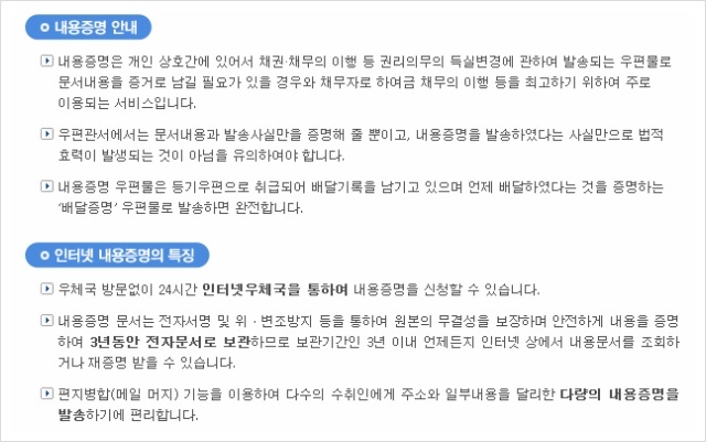 발송인이 수취인에게 어느 내용의 문서를 언제 발송하였다는 실태를 우편관서가 공적으로 증명시키는 우편 서비스입니다. 내용증명제도는 개인 상호간에 있으니까 채권•채무의 이행 등 권리의무의 득실 변경에 관해서 발송되는 우편물의 문서내용을 후일의 증빙로 남길 필요가 있을 경우와 채무자에게 채무의 이행 등을 최고하기 위한서 보통은 활용되는 제들어오게니다.