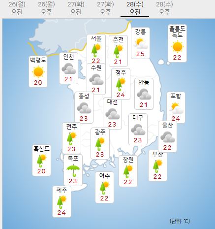 우리나라는 보통 제주도에서 6월 중순 후반(6월 19일경) 부터 장마가 시초로 해서 남부 지방(6월 23일경) 에 비를 내린 후 중부지역(6월 25일경) 까지 장마가 올라오게 되는데요, 장마 기간의 일수를 참조해 보면 제주도가 32.4일로 최고 길고, 남부와 중부지역은 약 31일 정도로 생각됩니다.