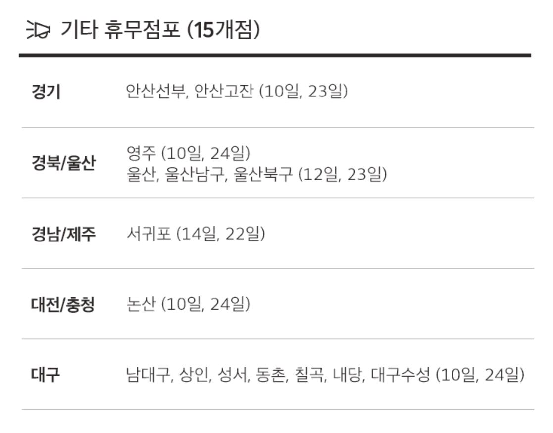 • 7월 10일, 7월 24일 휴무: 상인, 내당, 성서, 동촌, 대구수성, 남대구, 칠곡, 논산, 영주